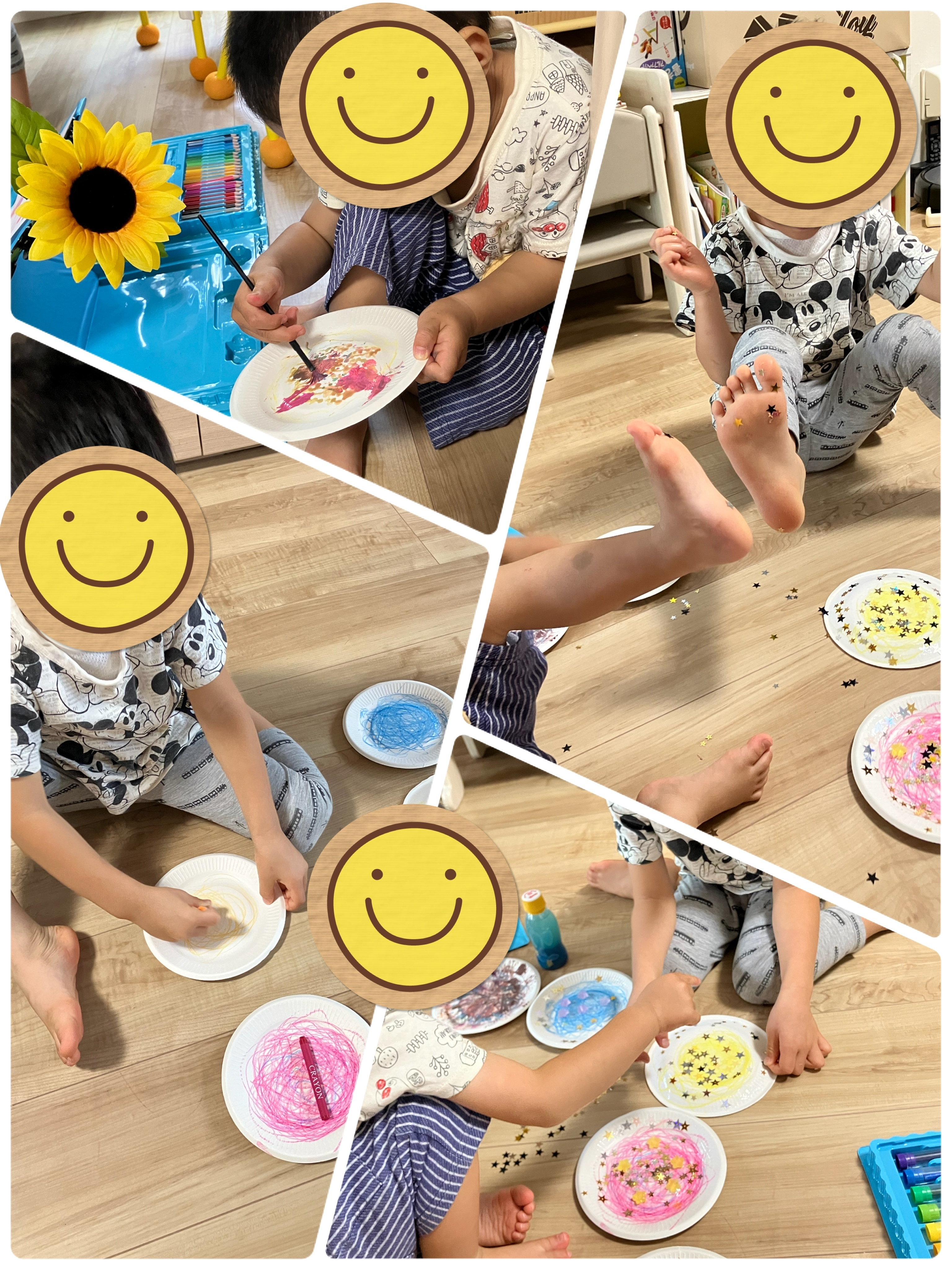 向日葵、作ろうか❣️って話をしていたので綿棒を束ねて紙皿の中央に絵の具を付けてポンポンしていたら一枚で飽きたようで。