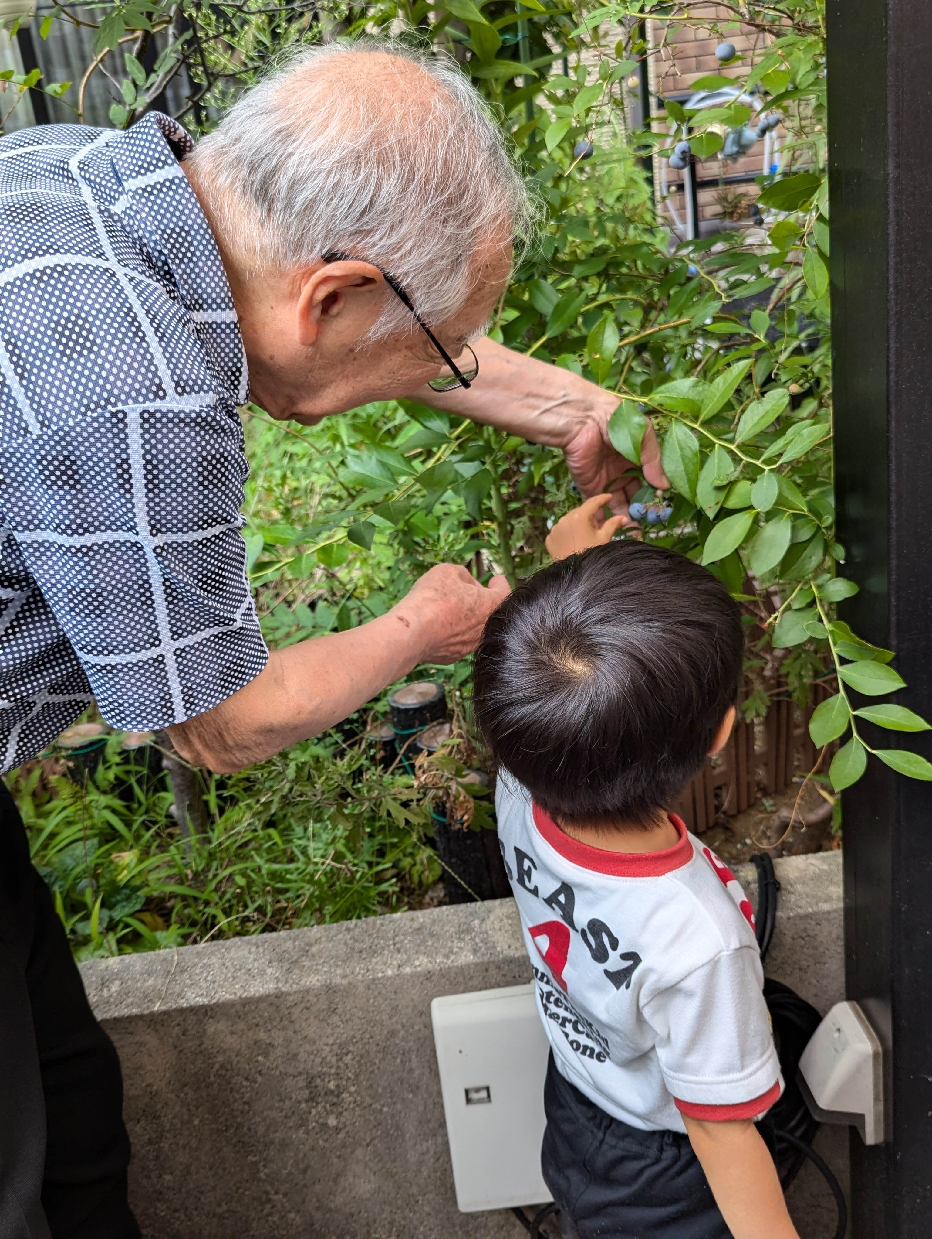 「ぶろー(ぶどう)」(似ているので間違えています)と言いながら、摘んで食べたり、サポートしていたおじいちゃんに渡したり…。