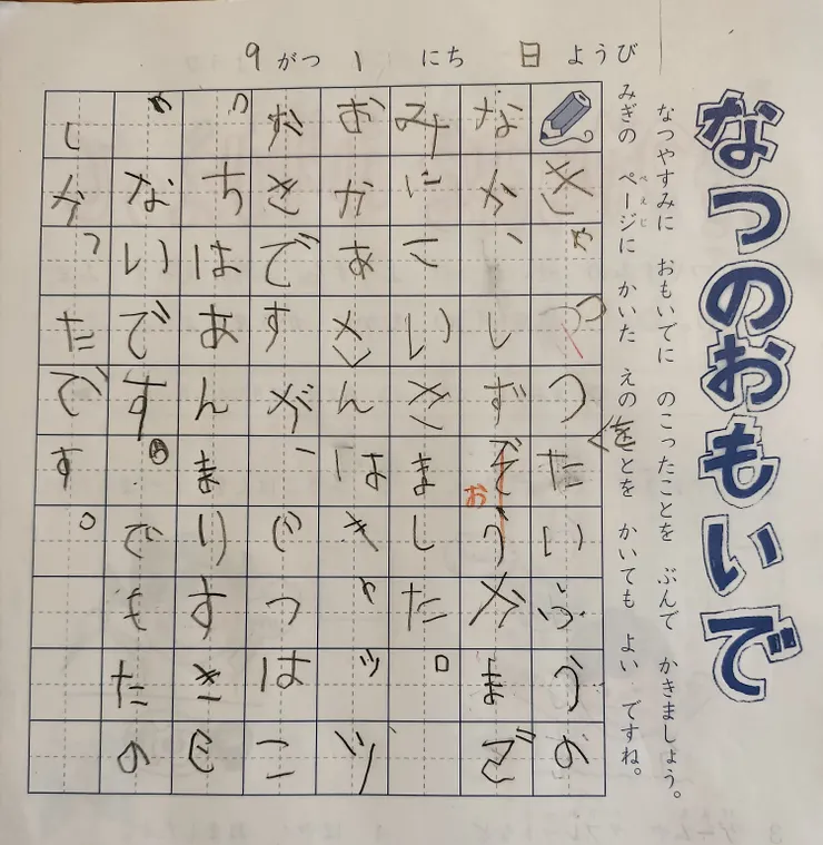 夏休みの日誌の最後の1ページが書けてなかったので、今日書かせたところ、