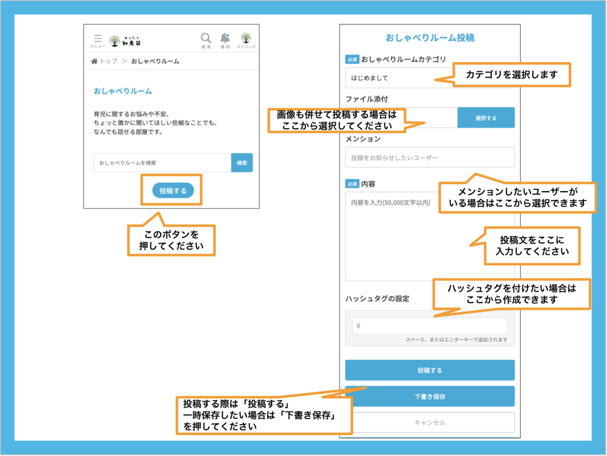 「お写真・動画募集コーナー」でも「おしゃべりルーム」と同様に下書きや再編集が可能ですので、せひご活用ください!