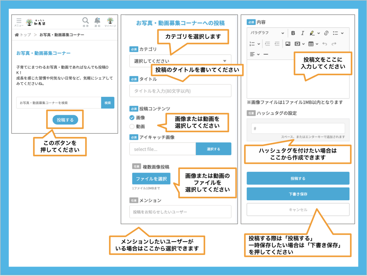 「お写真・動画募集コーナー」では、お子さまや子育てにまつわるものであればなんでも投稿OK!その他にも季節やイベントなどに合わせた投稿テーマが用意されます。