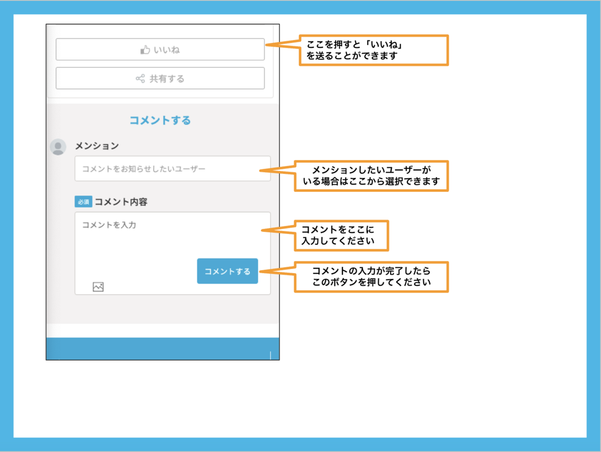みんなの投稿に「コメント」を残したり、仲間からのコメントに対して返信することもできます。