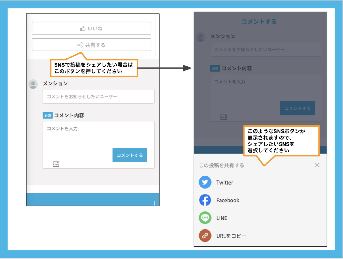 そのボタンを押すとTwitter・Facebook・LINEなどのSNSマークが表示されますので、共有したいSNSマークを押せば投稿を共有することが可能です。