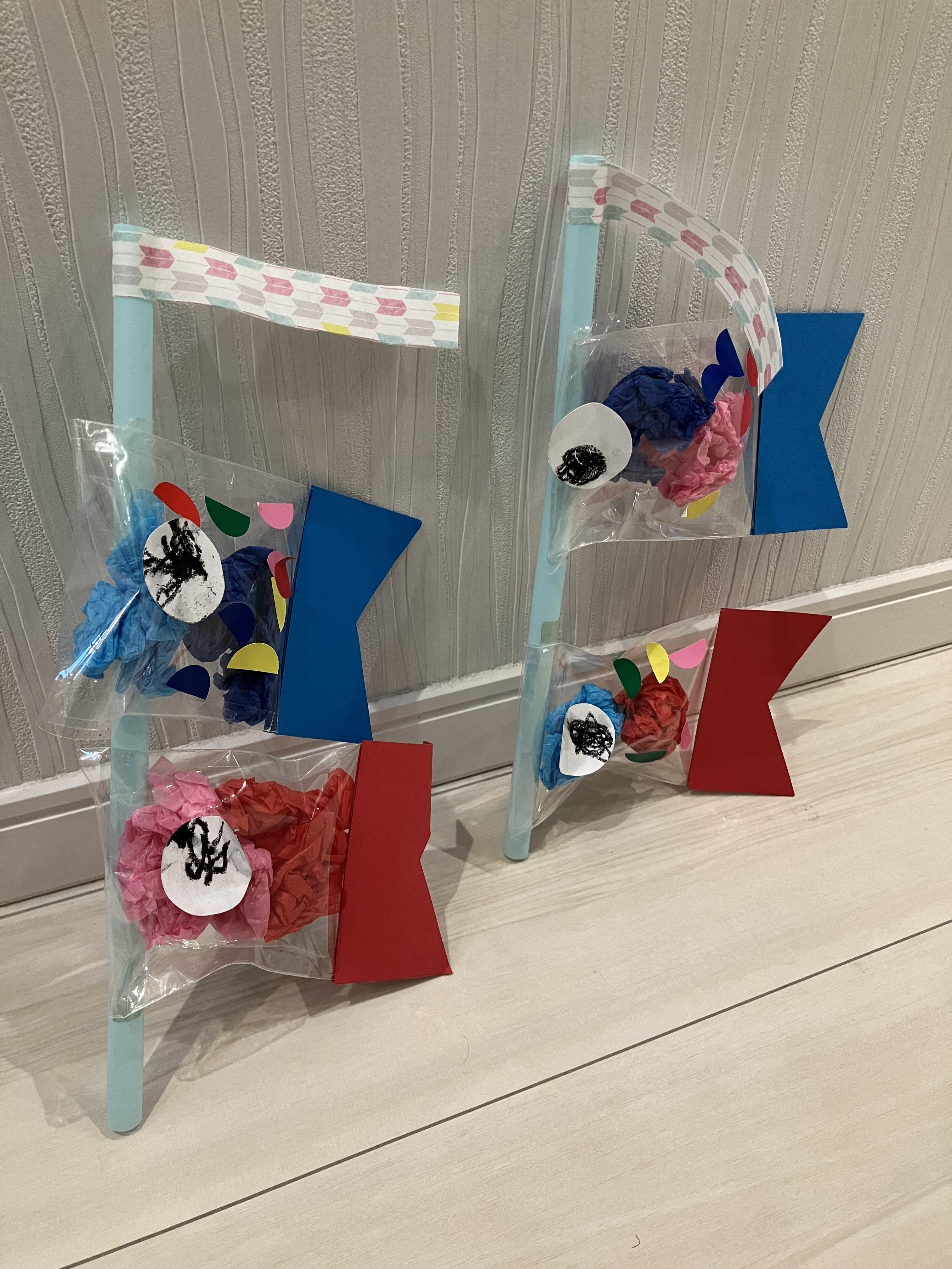 昨年度はスポット利用でしたが、4月から小集団療育をスタート。普段、席に座ることはまだまだ難しいけど、『コペルの先生はみんな好きなの』といつもお話ししてくれます。今日は弟が席に座ってるのを確認してサッと安心して入室することができていました。鯉のぼりの製作はとても集中して取り組む様子がありました。6人の集団でのサーキット、親子でだるまさんがころんだの静と動を周りの様子を見ながら楽しく取り組む様子がありました。リトミックのスピード調整は走りたくなりまだまだ難しいですが、かかしのポーズで止まるは習慣づいてきているようでした。個別では体験できないことをたくさん吸収できる機会であり、また異学年との貴重な時間で刺激を受けた日でした。