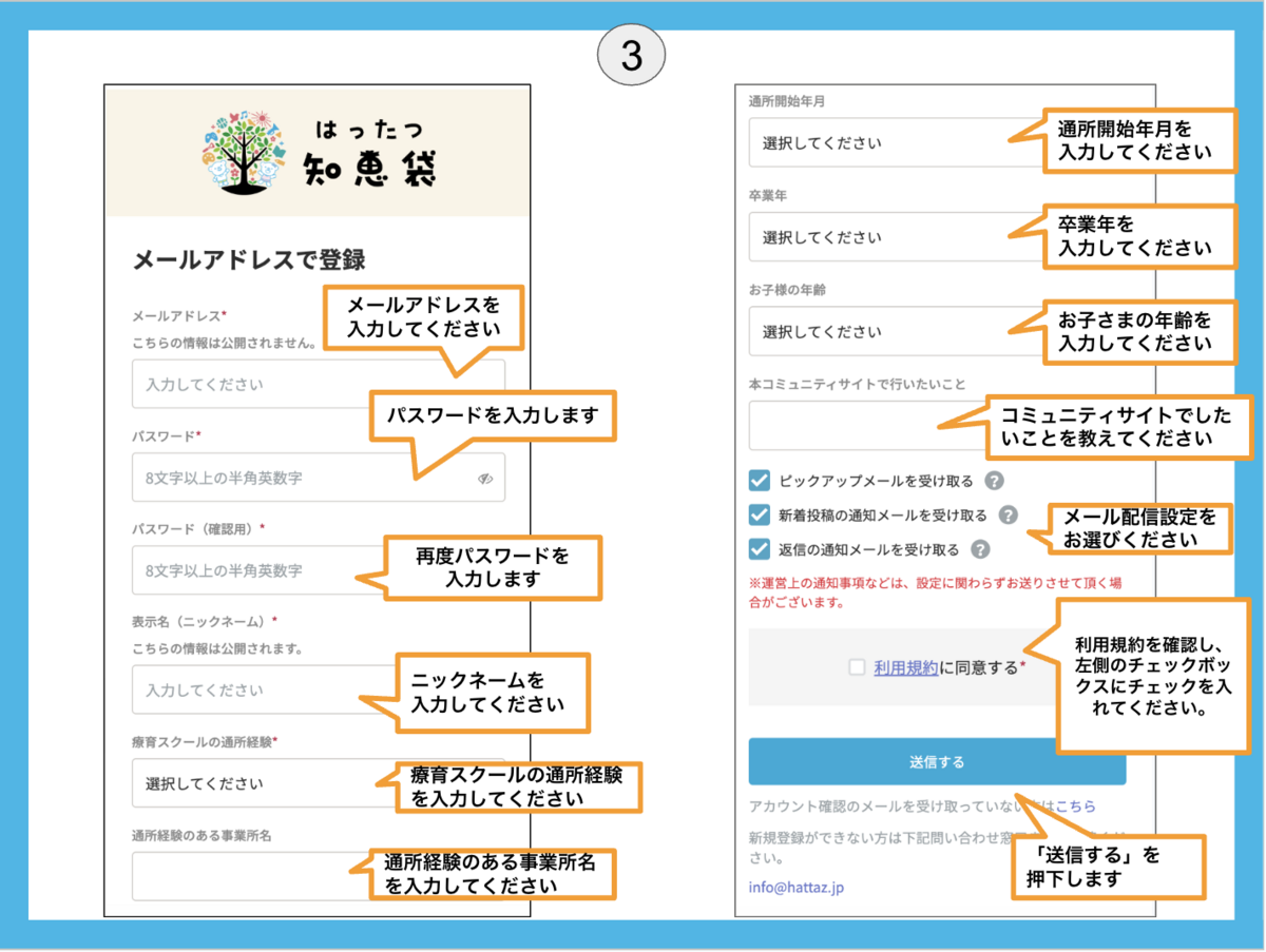 ③アカウント登録画面で「メールアドレス、パスワード、ニックネーム、療育スクールの通所経験、通所経験のある事業所名、通所開始年月、卒業年、お子様の年齢」