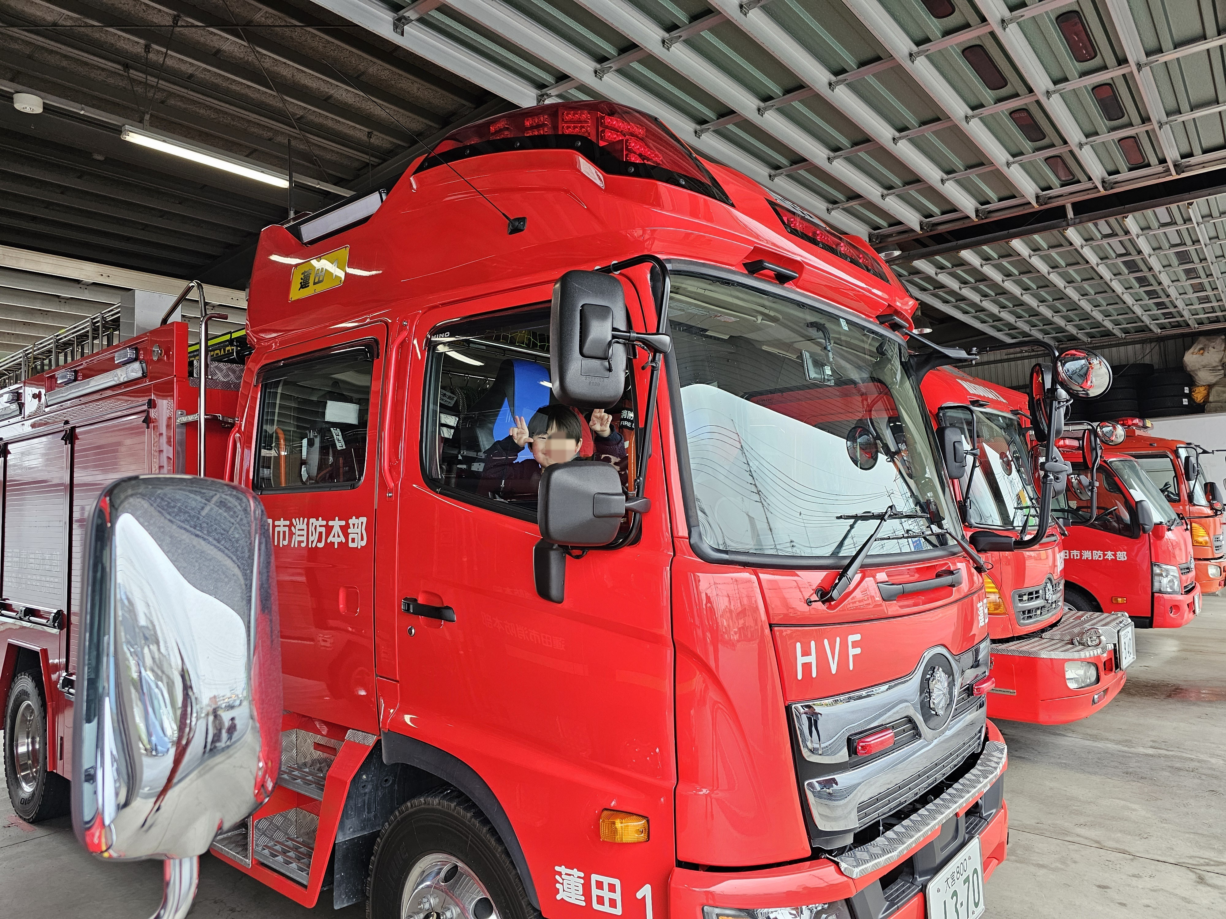 消防車の運転席に乗せてもらうとニコニコずっとしていて、写真を撮ろうとするとすかさずピース✌️
