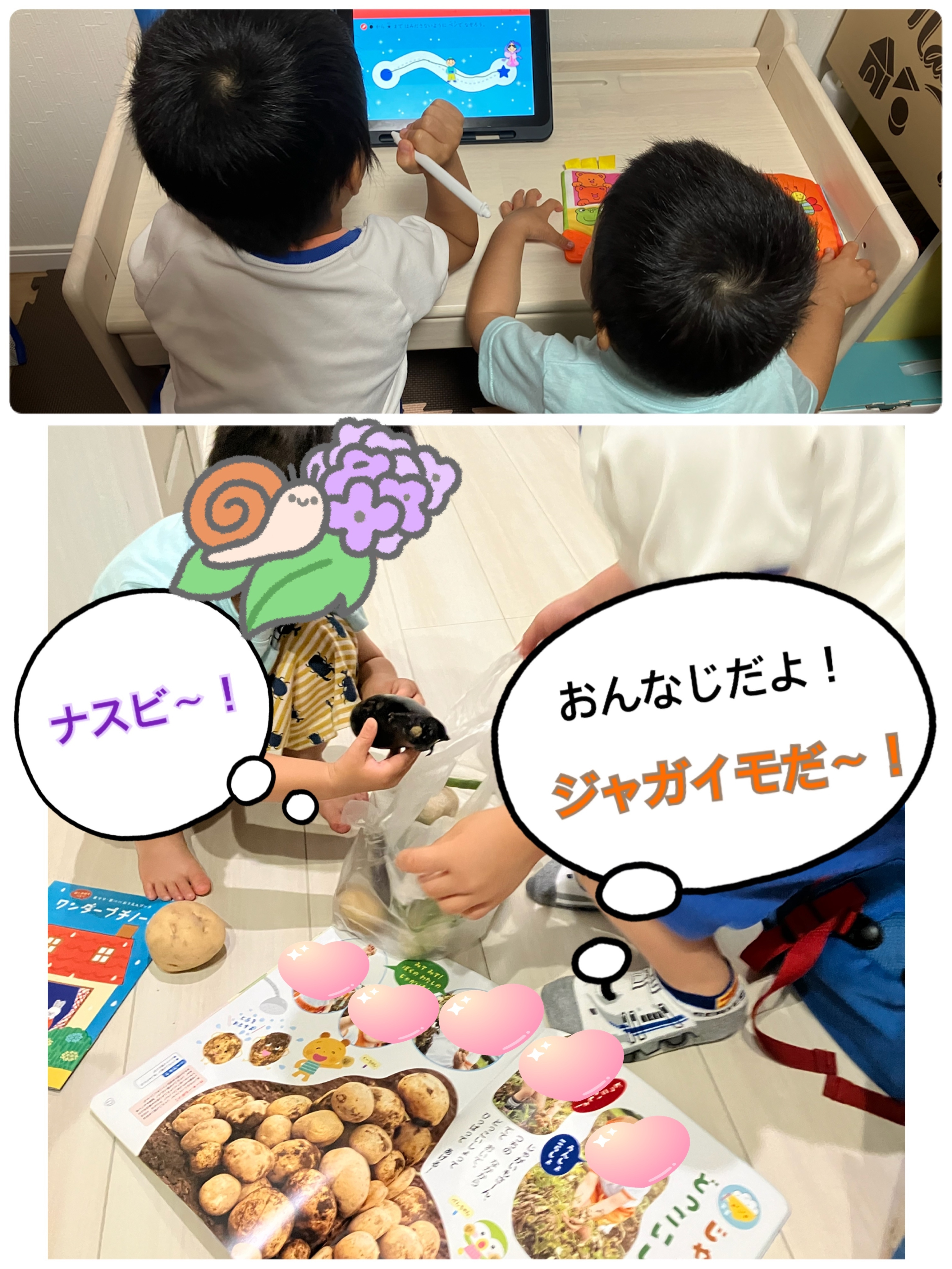 お野菜入りの袋を玄関に置いたままにしていたら長男がたまたま持ち帰って来た絵本に『ジャガイモ』のページがあることを開いて教えてくれました☆