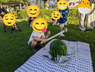 すいか割り🍉 いつもお世話になっている、フリーの保育士さん主催ですいか割りのイベントがありました🍉初めてのすいか割りでしたが、とても硬い良いすいかだったため、大人でも割ることが出来ず…😅しかし、子ども達はすいかを叩くこと自体が楽しかったようで、棒やピコピコハンマーでペシペシペシ…終始ニコニコでした☺️家では(もっ